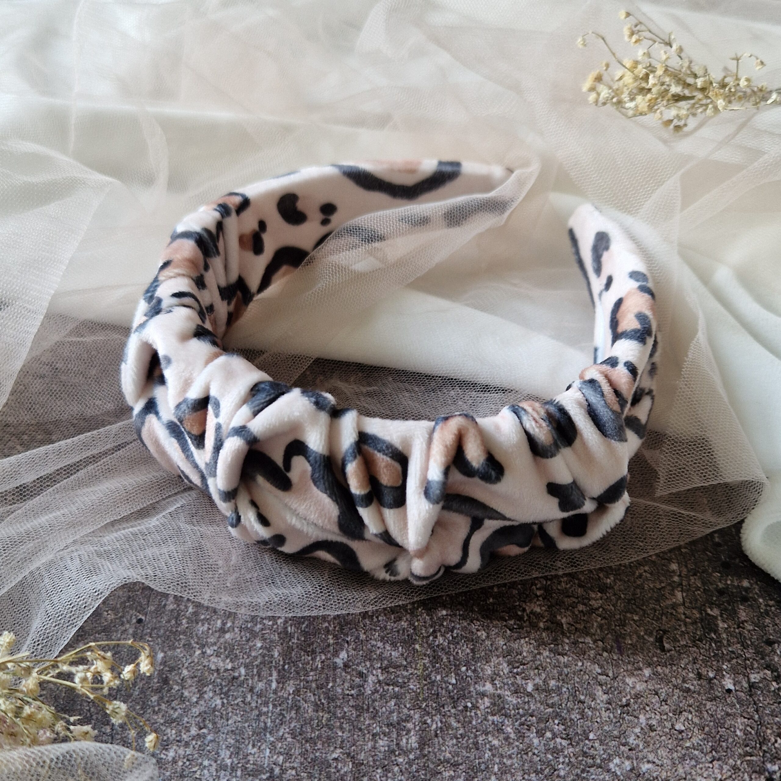 Opaska marszczona Panterka welur Mokka