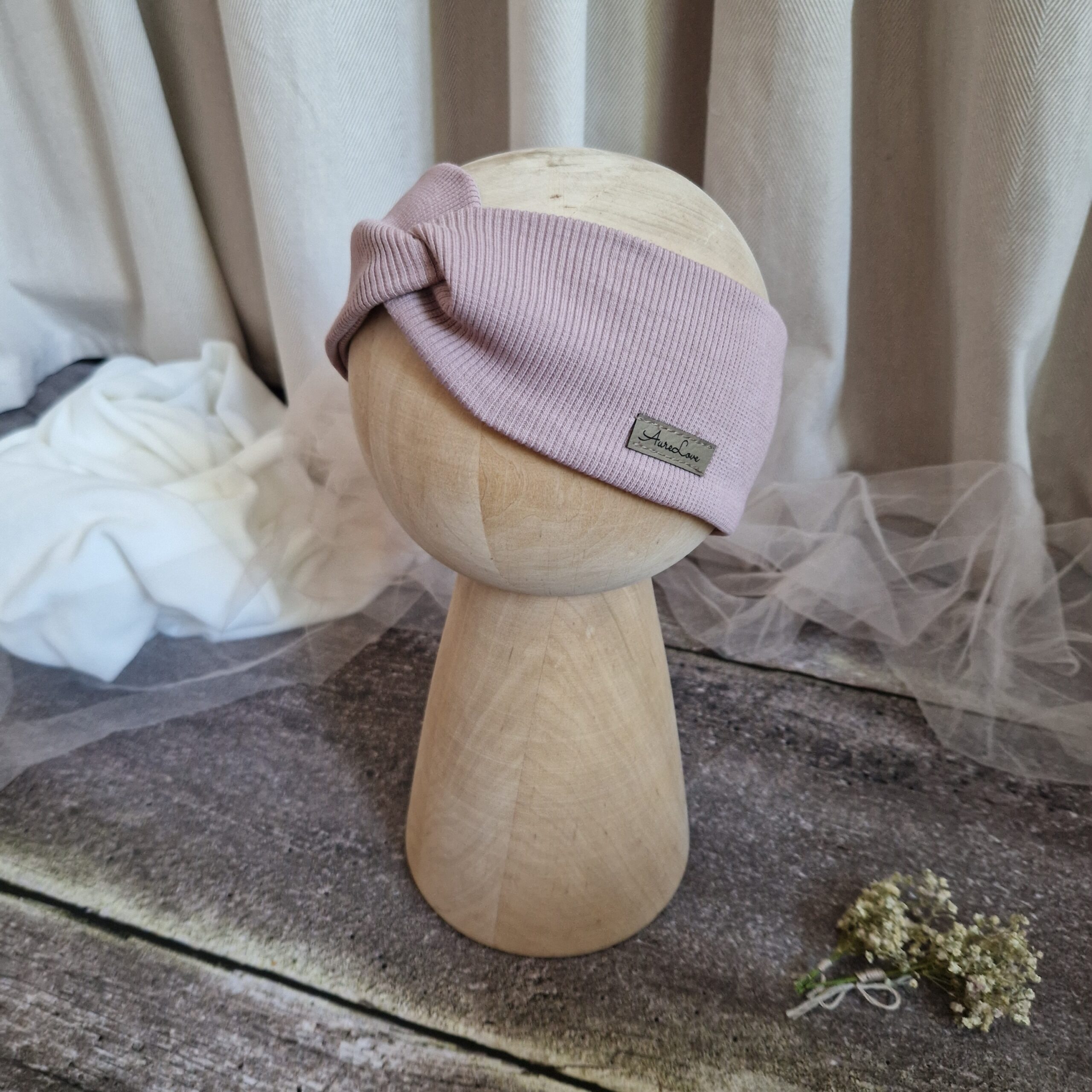 Opaska z bardzo elastycznej dzianiny prążkowanej – obwód głowy powinien być większy o ~8-10 cm od obwodu produktu, aby nie spadała podczas noszenia.