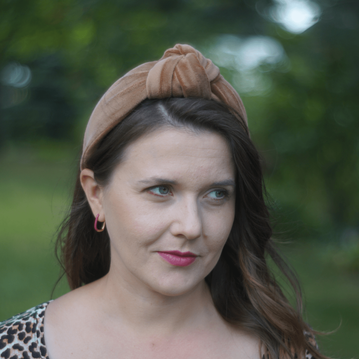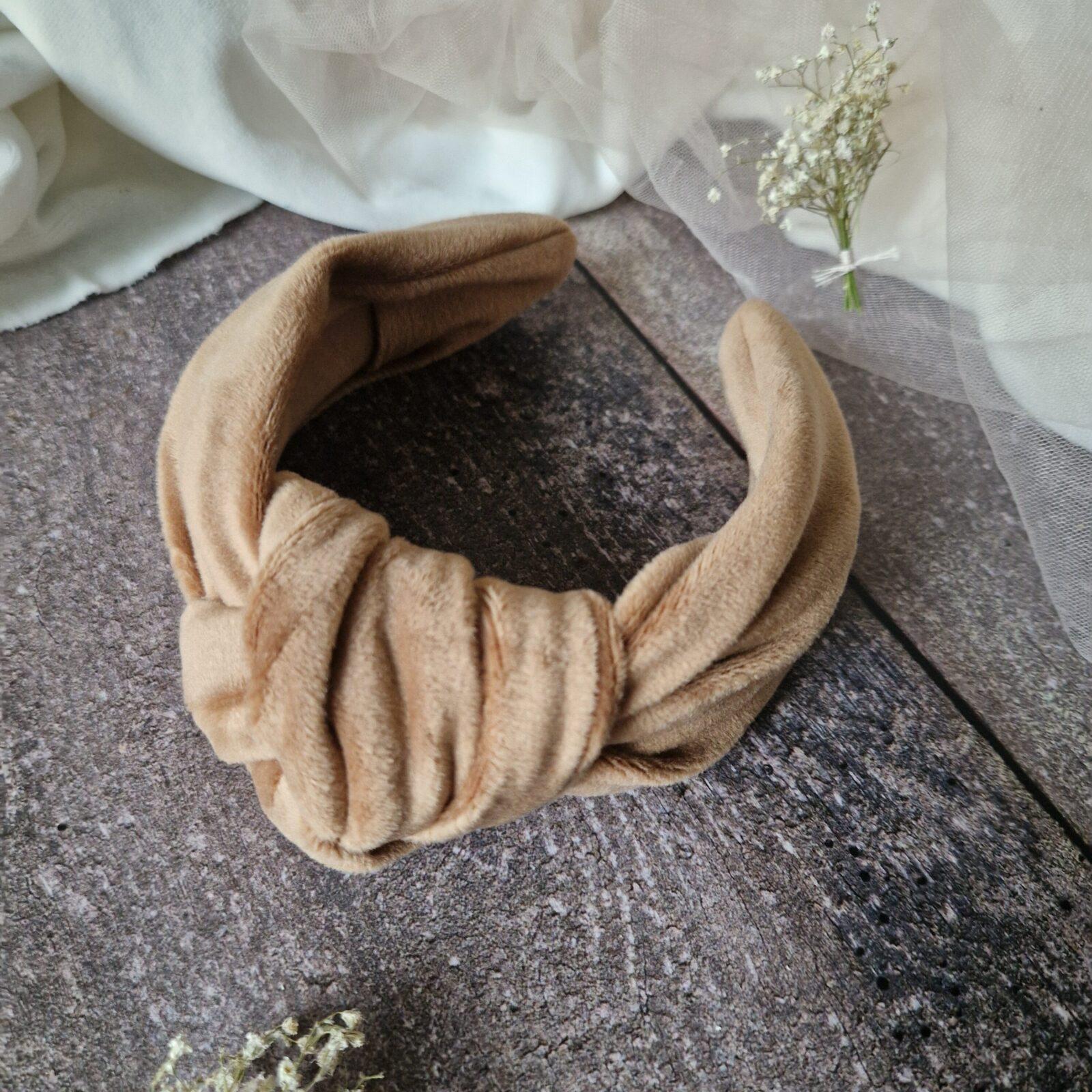 Marszczona opaska welurowa w odcieniu camel, ręcznie szyta w PolsceOpaska supeł Welur soft Camel