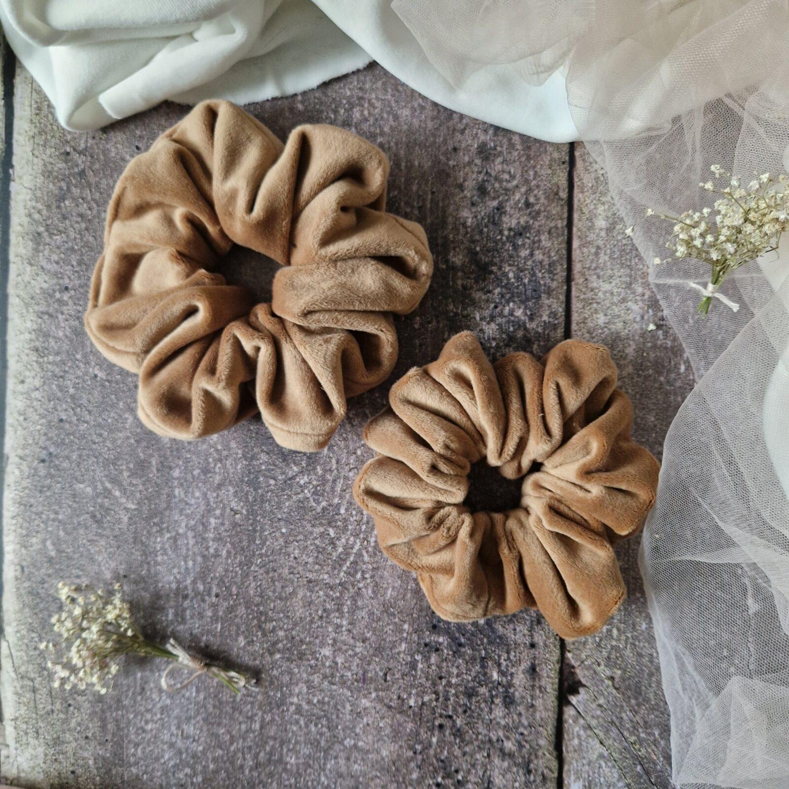Gumka do włosów scrunchie z miękkiego weluru w kolorze camel, ręcznie szyta w PolsceScrunchie Welur soft Camel